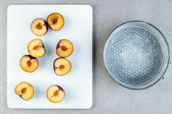 Den Backofen auf 200°C (180°C Umluft) vorheizen. Die Butter aus dem Kühlschrank nehmen und Raumtemperatur annehmen lassen. Zwei Springformen (à 20cm Ø) mit jeweils 1EL Butter aus dem Vorrat fetten, dann mit je 1EL Mehl bestäuben, dabei darauf achten, dass auch die Ränder bedeckt sind. Die Pflaumen halbieren und entsteinen.