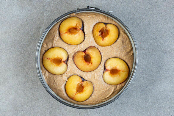 Den Teig in die Formen füllen. Die Pflaumen mit der Schnittseite nach oben auf den Teigen verteilen und sanft nach unten drücken, sodass Pflaumen und Teig je eine ebene Schicht bilden. Übrige Pflaumen ggf. für das Kompott aufbewahren. Die Kuchen 35–40Min. im Ofen goldbraun backen. Tipp: Der Teig darf um die Pflaumen herum ruhig noch etwas feucht sein.