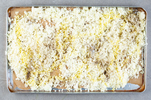 Den Blumenkohlreis auf einem mit Backpapier ausgelegten Backblech mit 3EL Olivenöl und je 1/2TL Salz und Pfeffer vermengen und im Ofen ca. 8Min. backen, bis der Blumenkohlreis gar und leicht gebräunt ist.