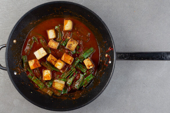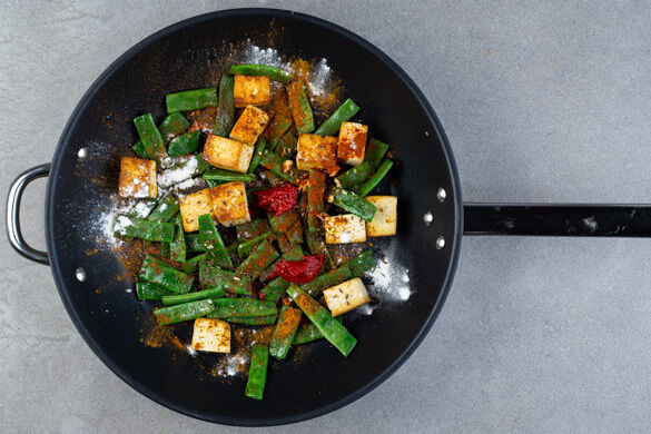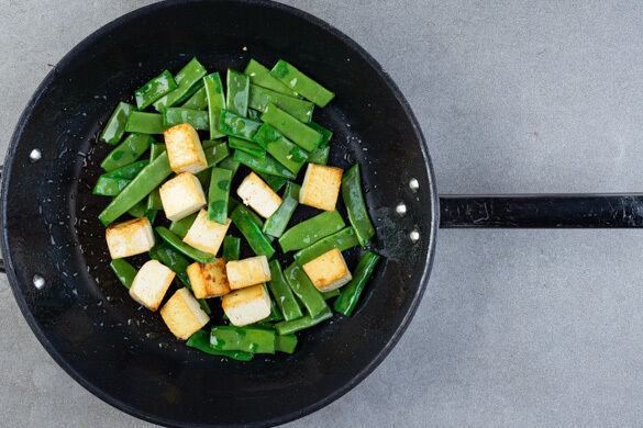 Die Bohnen und den Tofu in einer großen Pfanne mit 4EL Olivenöl und 2TL Salz bei sehr starker Hitze in 5–7Min. goldbraun braten.