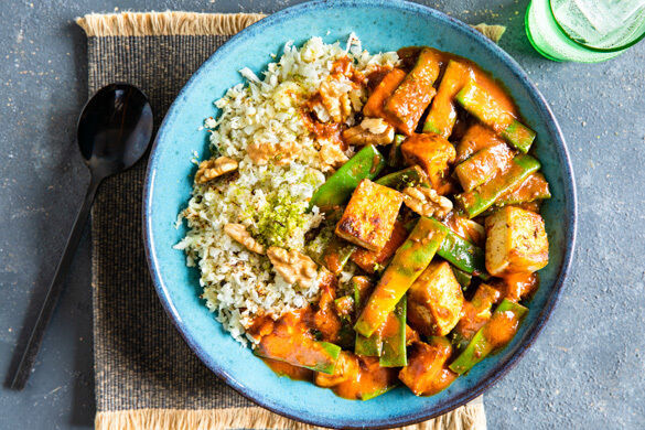 Oh, du wunderbare vegetarische Küche! Du hast es mal wieder geschafft: Wir sind hin und weg! Auf fluffig leichtem Blumenkohlreis kommst du daher, mit deinen frischen breiten Bohnen und deinen angebratenen Tofuwürfeln, mit deinem würzig aromatischen Saucenwunder aus Kümmel und Paprika, Tomatenmark, Limette und Ras el-Hanout. Und nicht zu vergessen deinen knusprigen Walnüssen, die dem Werk die Krone aufsetzen. Herrlich!