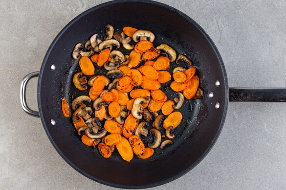 Die Karotten in einer großen Pfanne mit 1EL Pflanzenöl bei mittlerer bis starker Hitze 2–3Min. ohne Rühren anbraten. Die Pilze und 2 Prisen Salz hinzugeben, alles gut verrühren und noch ca. 5Min. unter Rühren braten, bis die Pilze goldbraun sind.