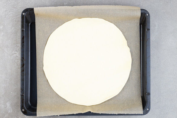 Den Backofen auf 190°C Umluft (210°C Ober-/Unterhitze) vorheizen. Den Teig mit dem Papier nach unten auf einem Backblech ausrollen.