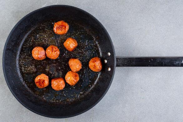 Die veganen Hackbällchen mit 2EL Olivenöl in einer mittelgroßen Pfanne bei mittlerer Hitze ca. 6Min. rundum braun braten, dann auf einem Teller beiseitestellen.