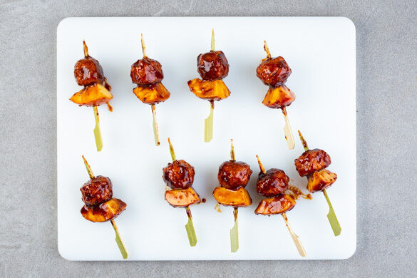 Die Sauce in derselben Pfanne bei niedriger Hitze erwärmen, dabei stetig rühren. Die Bällchen und die Pfirsiche dazugeben und in der Sauce wenden, bis sich eine dicke Glasur bildet, ggf. mehr Wasser hinzufügen. Die Pfirsiche und die Bällchen aus der Pfanne nehmen, mit je einem Zahnstocher mind. 1 Pfirsichstück und 1 Bällchen aufnehmen und servieren.