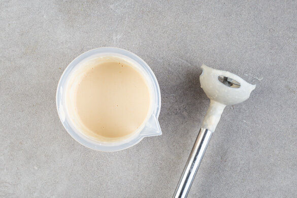 Die Bohnen in einem Sieb mit kaltem Wasser abspülen und abtropfen lassen, dann mit dem Tahini, dem restlichen Knoblauch, 1EL Olivenöl, 1–2EL Essig, 75ml Wasser und 1/2TL Salz in einem hohen Gefäß mit einem Stabmixer cremig pürieren. Bei Bedarf mehr Wasser hinzufügen, um die Bohnencreme streichfähiger zu machen.