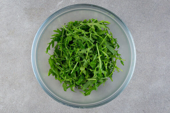 Den Rucola mit 1TL Essig und je 1 Prise Salz und Pfeffer vermengen.