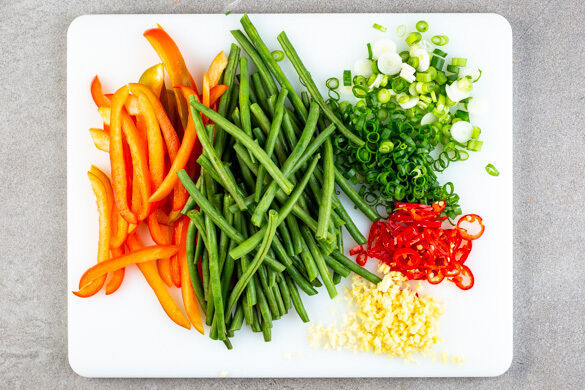 Die Enden der Bohnen entfernen. Die Paprika vierteln, entkernen und in dünne Streifen schneiden. Die Lauchzwiebel in feine Ringe schneiden, den grünen Teil beiseitelegen. Die Peperoni in feine Ringe schneiden. Tipp: Für weniger Schärfe die Kerne entfernen. Den Knoblauch und die 1/2 des Ingwers schälen und fein würfeln.
