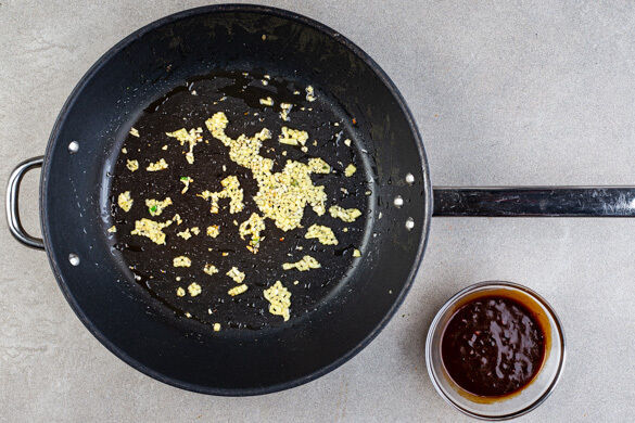 Die Bohnensauce mit der Hoisinsauce, 3EL Essig, 2EL Wasser und 1TL Zucker verrühren. Den Ingwer und den Knoblauch in der Pfanne bei mittlerer bis starker Hitze ca. 1Min. anbraten.