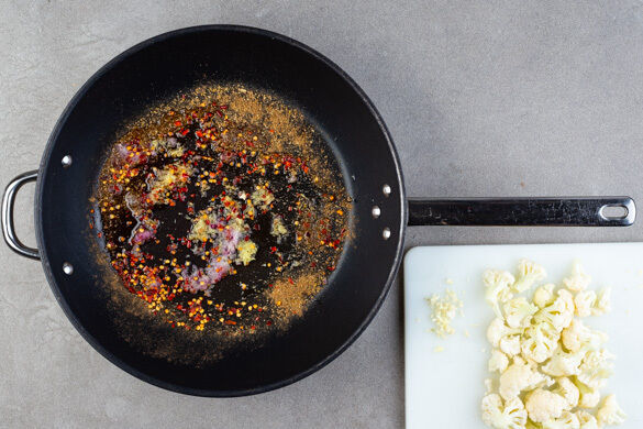 Den Ingwer und den Knoblauch schälen und fein reiben. Die Zwiebel schälen, halbieren, eine Hälfte fein reiben. Den Blumenkohl in kleine Röschen schneiden. Den Ingwer und die Zwiebeln in einer mittelgroßen Pfanne mit 1EL Pflanzenöl bei mittlerer Hitze 2–3Min. anbraten. Die Gewürzmischung, 1EL Chiliflocken und den Knoblauch zugeben und ca. 1Min. weiterbraten.