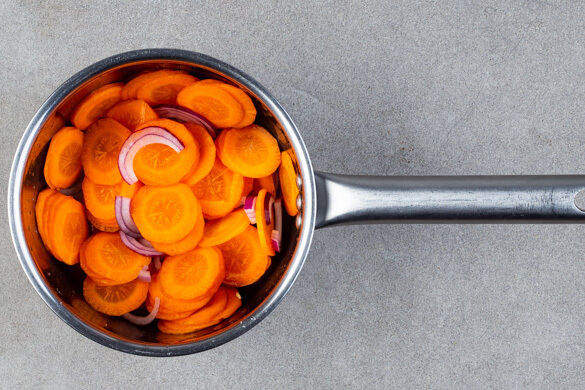Die Karotten ggf. schälen und in sehr dünne Scheiben schneiden. Die übrige Zwiebelhälfte in feine Streifen schneiden. Die Karotten und die Zwiebeln in einem zweiten kleinen Topf mit 3EL Essig, 80ml Wasser, 1/2TL Salz und 1TL Zucker zum Kochen bringen und ca. 7Min. weich kochen. In ein Sieb abgießen und abtropfen lassen.