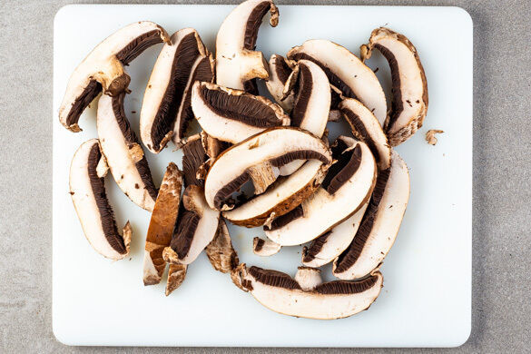 Den Backofen auf 220°C (200°C Umluft) vorheizen. Die Pilze in ca. 1cm breite Streifen schneiden.