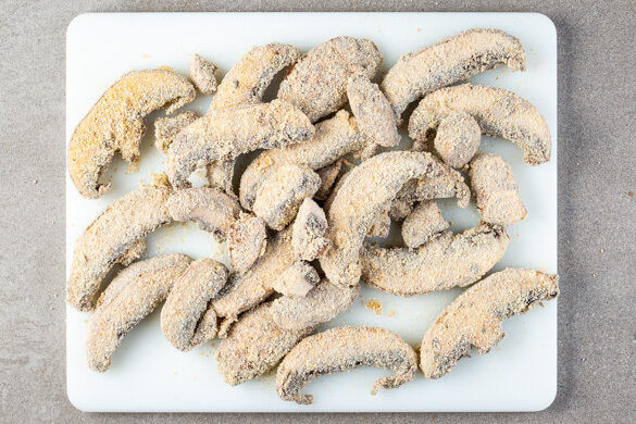 Die Semmelbrösel mit den Knoblauchflocken und 1TL Salz vermengen. 4EL Mehl, 150ml Milch sowie die Semmelbrösel-Mischung separat in tiefen Tellern bereitstellen. Die Pilze der Reihe nach in dem Mehl, der Milch und der Semmelbrösel-Mischung wenden, dabei darauf achten, dass alles gleichmäßig bedeckt ist und die Panade ggf. noch leicht andrücken.