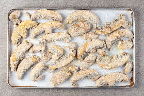 Die Semmelbrösel mit den Knoblauchflocken und 1,5TL Salz vermengen. 6EL Mehl, 200ml Milch sowie die Semmelbrösel-Mischung separat in tiefen Tellern bereitstellen. Die Pilze der Reihe nach in dem Mehl, der Milch und der Semmelbrösel-Mischung wenden, dabei darauf achten, dass alles gleichmäßig bedeckt ist und die Panade ggf. noch leicht andrücken.