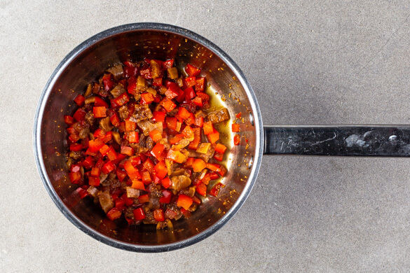 Die Paprika vierteln, entkernen und in ca. 1cm große Würfel schneiden. Die Paprika mit den Feigen, 1EL Zucker, 1/2TL Salz, 1EL Essig und 200ml Wasser abgedeckt in einem mittelgroßen Topf bei mittlerer Hitze 12–14Min. weich kochen. In den letzten 5Min. der Kochzeit den Deckel abnehmen und die Sauce einköcheln, bis die Flüssigkeit verdampft ist.