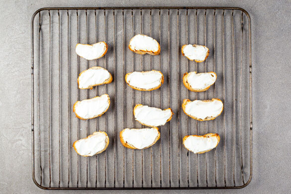 Die Brötchen schräg in 1–2cm dicke Scheiben schneiden und mit dem Ziegenfrischkäse bestreichen. Die Crostini auf einem Backrost verteilen und auf der oberen Schiene im Ofen in 6–7Min. goldbraun backen.