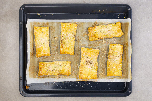 Die gegarten Auberginen aus dem Ofen nehmen und etwas abkühlen lassen. Die Temperatur des Ofens auf 210°C (180°C Umluft) reduzieren. Die Tiropitakia mit dem Sesam bestreuen und ca. 10Min. im Ofen goldbraun backen.