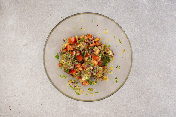 Die Zwiebel halbieren. Eine Hälfte schälen, fein würfeln und in einer kleinen Pfanne mit 1TL Olivenöl bei mittlerer Hitze 2–3Min. glasig anschwitzen. Die übrige Zwiebel für ein anderes Rezept aufbewahren. Die Tomaten halbieren und in ca. 1cm große Würfel schneiden. Das Fruchtfleisch der Auberginen mit einem Löffel aus der Schale lösen und mit einer Gabel zerdrücken.