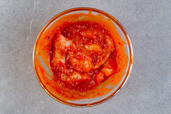 Das Fleisch trocken tupfen, horizontal halbieren und mit der Harissa-Paste, 1TL Salz sowie 1 Prise Pfeffer vermengen.