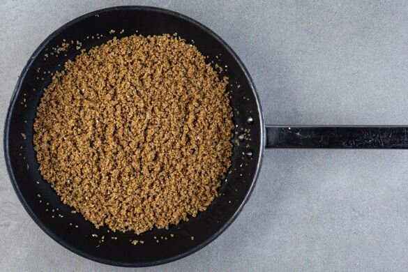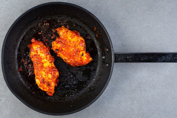 Das Fleisch in einer zweiten mittelgroßen Pfanne mit 1TL Olivenöl bei mittlerer Hitze auf jeder Seite 4–5Min. braten, bis das Fleisch goldbraun und gar ist. Die Pfanne vom Herd nehmen und das Fleisch abgedeckt warm halten.