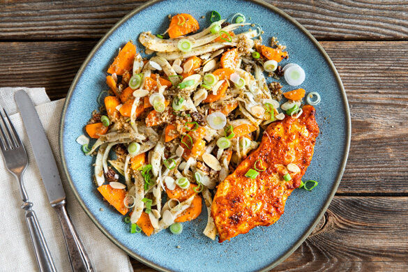 Den Fenchel-Karotten-Salat und das Fleisch auf Teller verteilen, mit den Lauchzwiebelringen sowie den Mandelblättchen garnieren und servieren.