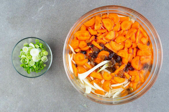 Den Fenchel längs halbieren und in dünne Streifen schneiden, dabei jeweils den Strunk entfernen. Die Karotten ggf. schälen und in dünne Scheiben schneiden. Den Fenchel und die Karotten mit den Datteln, 2EL (hellem) Essig und 1,5TL Salz vermengen. Ausreichend warmes Wasser hinzufügen, um die Datteln einzuweichen. Die Lauchzwiebeln in feine Ringe schneiden.
