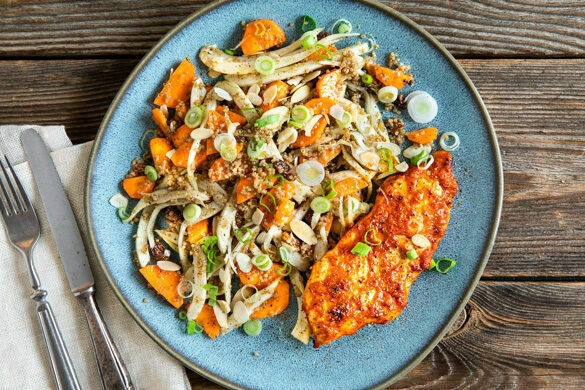 Den Fenchel-Karotten-Salat und das Fleisch auf Teller verteilen, mit den Lauchzwiebelringen sowie den Mandelblättchen garnieren und servieren.
