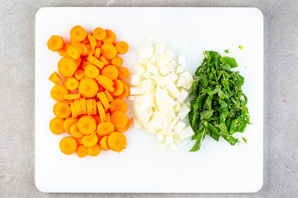 Die Karotte ggf. schälen und in dünne Scheiben schneiden. Die Zwiebel schälen, halbieren und grob würfeln. Die Minzeblätter von den Stängeln zupfen und grob schneiden.