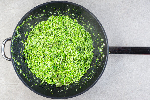 Den Brokkolireis in einer zweiten großen Pfanne mit 1TL Pflanzenöl bei mittlerer Hitze 5–6Min. erwärmen, dabei gelegentlich umrühren. Die Pfanne vom Herd nehmen und 3/4 der Minze unterrühren.