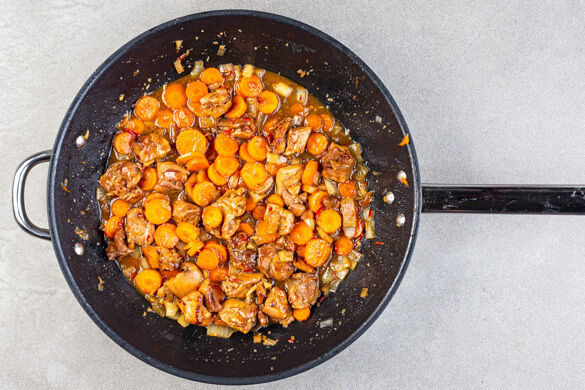 Die Karotten und die Zwiebeln zu dem Fleisch in die Pfanne geben und ca. 1Min. mitbraten. 1TL Brühgewürz und die Tamarindenpaste mit 100ml Wasser in der Pfanne verrühren. Die Hitze verringern und alles ca. 10Min. abgedeckt köcheln lassen.