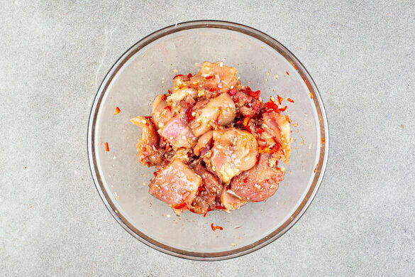 Das Fleisch trocken tupfen und in 2–3cm große Stücke schneiden. Die Peperoni längs halbieren und in dünne Streifen schneiden. Die oberen 3cm des Zitronengrases entfernen, das übrige Zitronengras mit der Rückseite eines Messers flach klopfen und fein würfeln. Das Fleisch mit der Peperoni, dem Zitronengras, der 1/2 der Fischsauce und 4TL (braunem) Zucker vermengen.