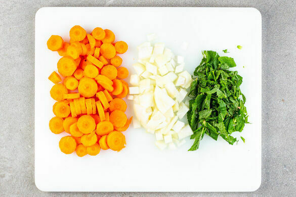 Die Karotten ggf. schälen und in dünne Scheiben schneiden. Die Zwiebel schälen, halbieren und grob würfeln. Die Minzeblätter von den Stängeln zupfen und grob schneiden.