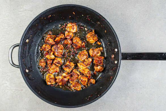 Das Fleisch in einer großen Pfanne mit 3–4EL Pflanzenöl bei mittlerer bis starker Hitze in 4–5Min. rundum braun anbraten.