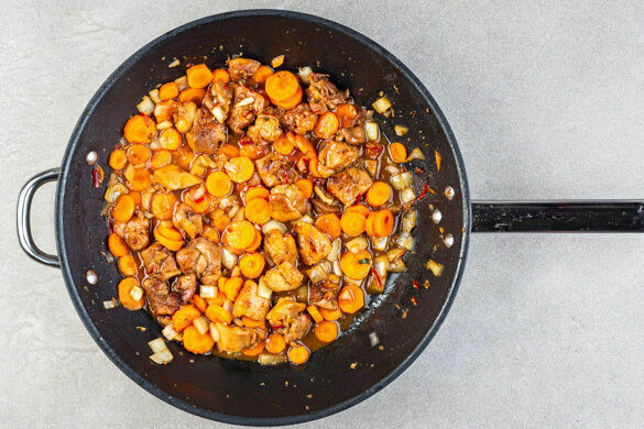 Die Karotten und die Zwiebeln zu dem Fleisch in die Pfanne geben und 1–2Min. mitbraten. 2TL Brühgewürz und die Tamarindenpaste mit 175ml Wasser in der Pfanne verrühren. Die Hitze verringern und alles ca. 10Min. abgedeckt köcheln lassen.