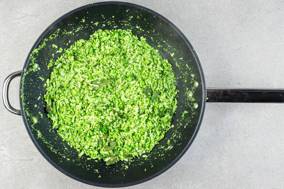 Den Brokkolireis in einer zweiten großen Pfanne mit 1–2TL Pflanzenöl bei mittlerer Hitze 5–6Min. erwärmen, dabei gelegentlich umrühren. Die Pfanne vom Herd nehmen und 3/4 der Minze unterrühren.