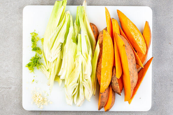 Den Backofen auf 240°C (220°C Umluft) vorheizen. Den Knoblauch schälen und fein würfeln. Die Süßkartoffel samt Schale in ca. 1cm breite Spalten schneiden. Den Fenchel längs halbieren und in ca. 1cm breite Spalten schneiden, dabei den Strunk entfernen. Evtl. vorhandenes Fenchelgrün für die Garnitur beiseitelegen.