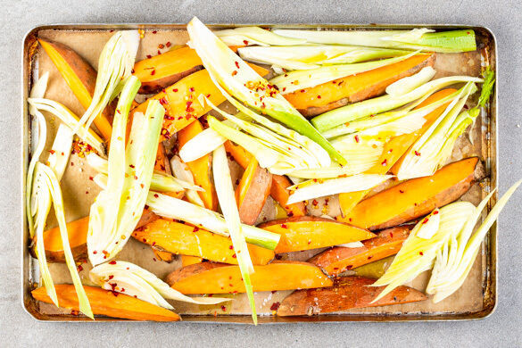 Die Süßkartoffeln und den Fenchel mit 1EL Olivenöl, 1/2TL Salz und den Chiliflocken nach Geschmack vermengen und auf einem mit Backpapier ausgelegten Backblech verteilen. Das Gemüse 20–25Min. im Ofen goldbraun backen.