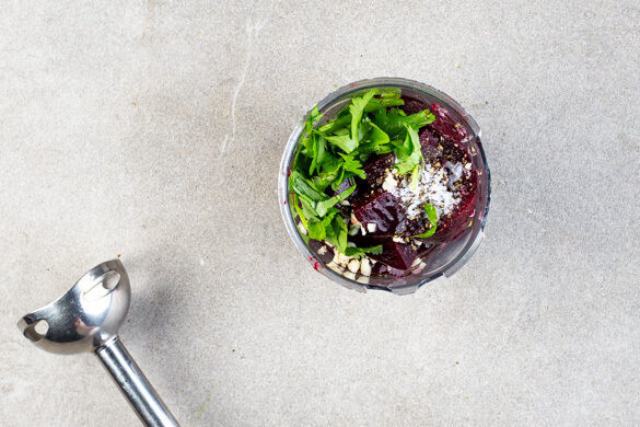 Die Rote Bete sowie den Koriander samt Stängeln grob schneiden. Da Rote Bete stark färbt, dabei am besten Küchenhandschuhe und Schürze tragen. Die Rote Bete, die 1/2 des Korianders und die 1/2 des Knoblauchs mit 1–2EL Olivenöl, 1EL Essig, 1TL Honig, 1–2TL (heißem) Wasser sowie je 1/2TL Salz und Pfeffer in ein hohes Gefäß geben und mit einem Stabmixer cremig pürieren.