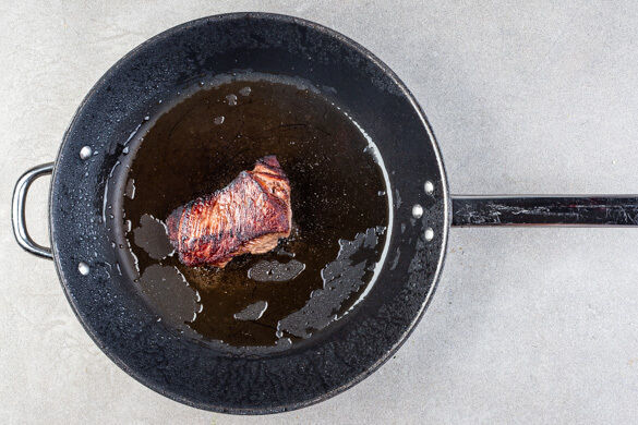 Das Fleisch trocken tupfen, mit je 1/2TL Salz und Pfeffer würzen und in einer mittleren Pfanne mit 1EL Olivenöl bei starker Hitze auf der Fettseite 2–4Min. scharf anbraten. Wenden und weitere 2–4Min. braten, je nach Dicke des Fleisches. Die Hitze reduzieren und das Fleisch 1–3Min. abgedeckt garen, je nachdem, ob es medium oder durch sein soll. Abgedeckt auf einem Teller ruhen lassen.