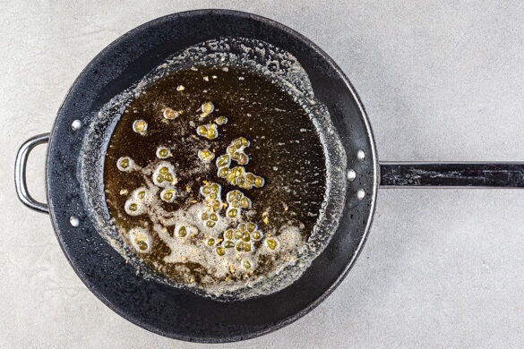 Den restlichen Knoblauch in derselben Pfanne mit 1TL Butter bei mittlerer Hitze ca. 30Sek. anbraten, dabei gelegentlich umrühren und ggf. vorhandene Bratreste vom Pfannenboden lösen. Tipp: Die Pfanne zuvor etwas abkühlen lassen, damit der Knoblauch nicht verbrennt. Die Kapern sowie 2TL Wasser hinzufügen, ca. 30Sek. erwärmen und die Pfanne vom Herd nehmen.