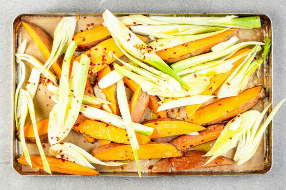 Die Süßkartoffeln und den Fenchel mit 3EL Olivenöl, 1TL Salz und den Chiliflocken nach Geschmack vermengen und auf zwei mit Backpapier ausgelegten Backblechen verteilen. Das Gemüse 20–25Min. im Ofen goldbraun backen. Nach der Hälfte der Zeit die Position der Bleche tauschen.