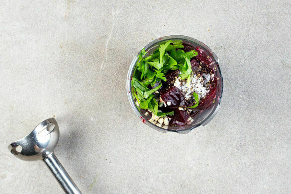 Die Rote Bete sowie den Koriander samt Stängeln grob schneiden. Da Rote Bete stark färbt, dabei am besten Küchenhandschuhe und Schürze tragen. Die Rote Bete, die 1/2 des Korianders und die 1/2 des Knoblauchs mit 3EL Olivenöl, 2EL Essig, 2TL Honig, 2–4TL (heißem) Wasser sowie je 1TL Salz und Pfeffer in ein hohes Gefäß geben und mit einem Stabmixer cremig pürieren.