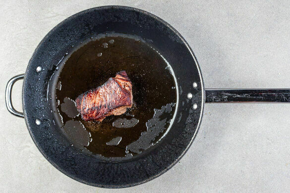 Das Fleisch trocken tupfen, mit je 1TL Salz und Pfeffer würzen und in einer großen Pfanne mit 2EL Olivenöl bei starker Hitze auf der Fettseite 2–4Min. scharf anbraten. Wenden und weitere 2–4Min. braten, je nach Dicke des Fleisches. Die Hitze reduzieren und das Fleisch 1–3Min. abgedeckt garen, je nachdem, ob es medium oder durch sein soll. Abgedeckt auf einem Teller ruhen lassen.