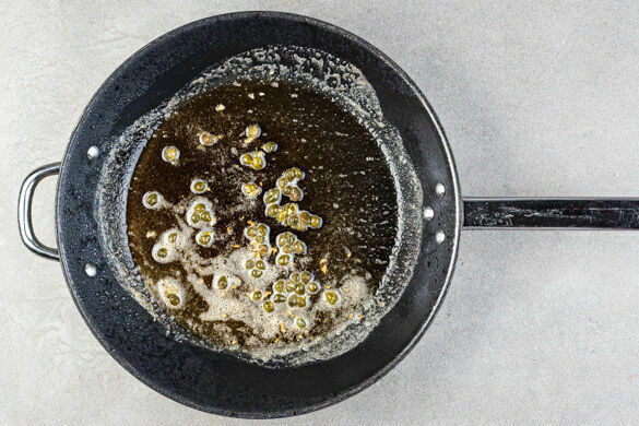 Den restlichen Knoblauch in derselben Pfanne mit 1EL Butter bei mittlerer Hitze ca. 30Sek. anbraten, dabei gelegentlich umrühren und ggf. vorhandene Bratreste vom Pfannenboden lösen. Tipp: Die Pfanne zuvor etwas abkühlen lassen, damit der Knoblauch nicht verbrennt. Die Kapern sowie 4TL Wasser hinzufügen, ca. 30Sek. erwärmen und die Pfanne vom Herd nehmen.