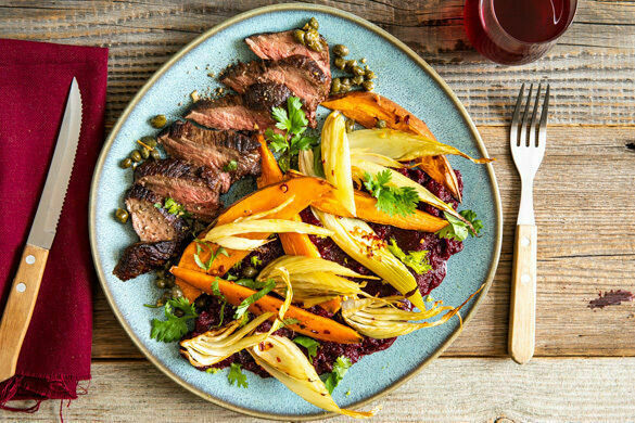 Wir haben für dich zwar nicht das Rad, aber (auch nicht zu verachten) die klassische Kombination aus Rindersteak mit Roter Bete neu erfunden. Diesmal pürieren wir die purpurrote Rübenart mit aromatischem Knoblauch und frischem Koriander. Pikant geröstete Süßkartoffel- und Fenchelspalten können es kaum erwarten, hineingedippt zu werden. Auch das Steak bekommt eine Sonderbehandlung in Form einer feinen Kapernsauce. Genial!