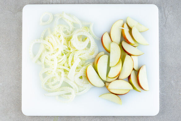 Den Backofen auf 220°C (200°C Umluft) vorheizen. Den Fenchel am Strunkende ca. 1cm abschneiden, dann den Fenchel quer in ca. 0,5cm dünne Ringe schneiden. Es ist ok, wenn die Ringe dabei nicht intakt bleiben. Den Apfel halbieren, entkernen und in ca. 1cm breite Spalten schneiden.