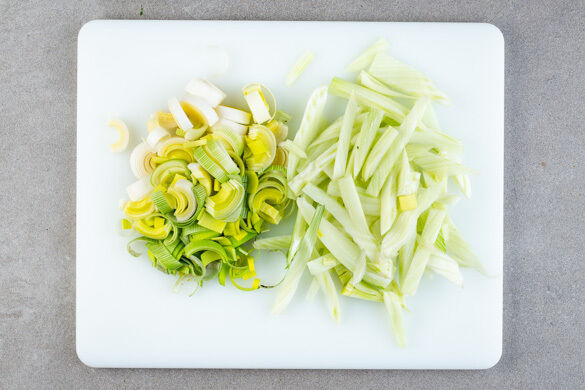 Den Lauch längs halbieren und quer in ca. 0,5cm breite Streifen schneiden. Den Fenchel längs halbieren und in ca. 1cm breite Streifen schneiden, dabei den Strunk entfernen. Ggf. vorhandenes Fenchelgrün fein schneiden und für die Garnitur beiseitelegen.