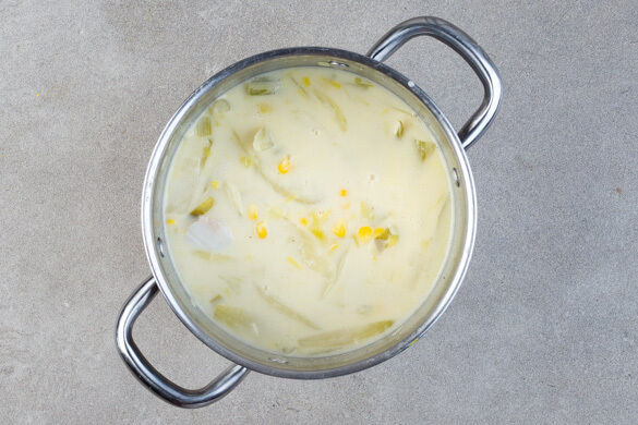 Den Lauch und den Fenchel mit je 1/2TL Salz und Pfeffer in einem mittelgroßen Topf mit 2EL Olivenöl bei mittlerer Hitze ca. 5Min. braten, bis das Gemüse weich ist. 2TL Mehl einrühren und ca. 1Min. anschwitzen. 750ml Wasser mit 1EL Essig und dem Brühgewürz in den Topf geben und abgedeckt zum Kochen bringen, dann die Hitze reduzieren und ca. 10Min. weiterkochen.