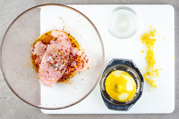 In einem großen Topf ausreichend gesalzenes Wasser für den Blumenkohl zum Kochen bringen. Die Zitronenschale abreiben und die Zitrone auspressen. Das Fleisch trocken tupfen und jeweils horizontal halbieren. 2EL Olivenöl, 1EL Zitronensaft, die 1/2 der Gewürzmischung, die Chiliflocken und je 1 kräftige Prise Salz und Pfeffer verrühren und das Fleisch darin marinieren.