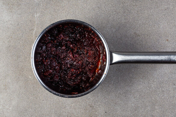 Die Zwiebeln in einem kleinen Topf mit 1EL Olivenöl und 1 Prise Salz bei mittlerer Hitze 1–2Min. glasig andünsten. Die Cranberrys, 1–2TL Zucker, 1TL Essig und 200ml Wasser hinzufügen und ca. 15Min. köcheln lassen, bis der Dip eingedickt ist. Mit einem Stabmixer grob pürieren.